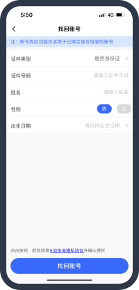 找回賬號適用于身份信息已綁定歷史賬號,但歷史賬號手機號又停用,無法操作更換手機號的情況;客戶可以通過綁定的身份找回賬號并更換為新手機號