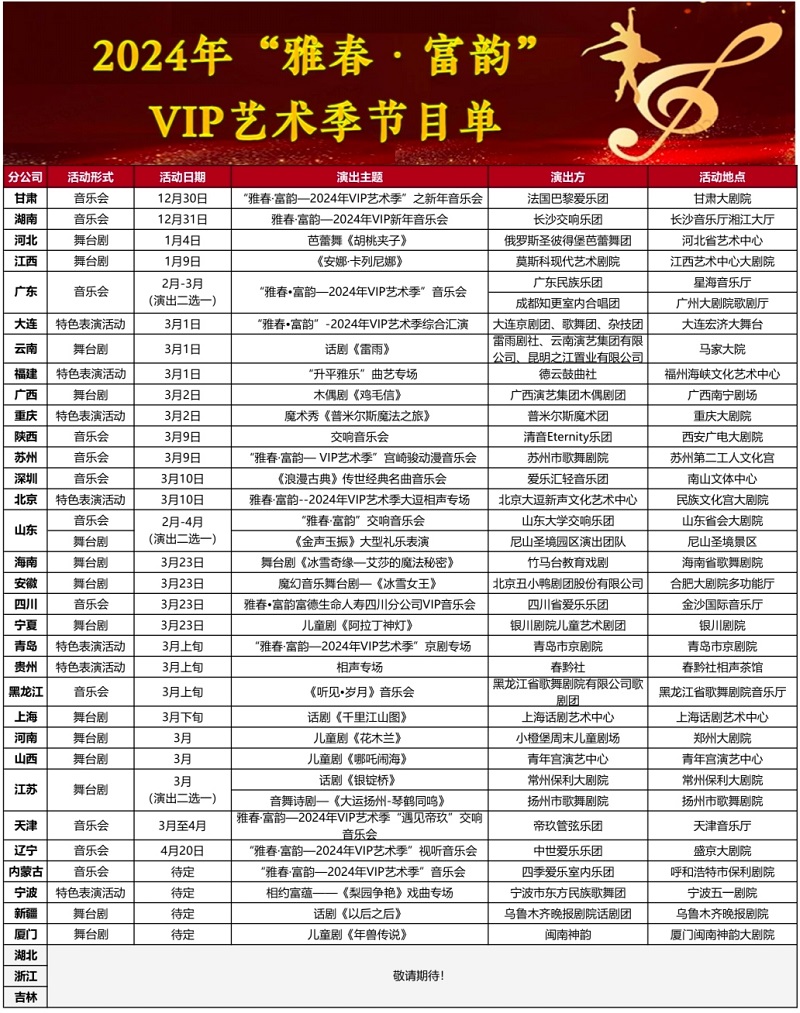 歲歲年年,共占春風。富德生命人壽2024年“雅春•富韻”VIP藝術季與客戶再度攜手,三十余場演出將在全國掀起藝術鑒賞熱潮,在嶄新歲月邀客戶共同探索新的藝術體驗,遇見詩意與美好。