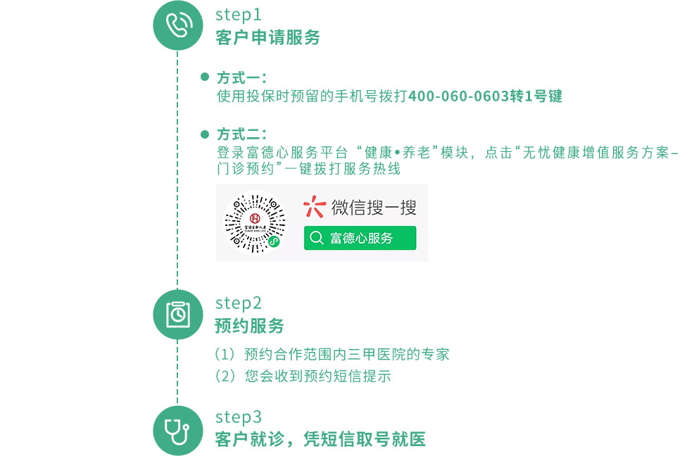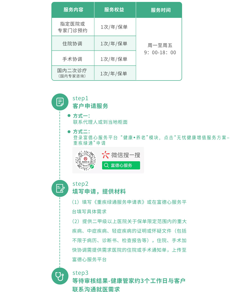 為符合一定服務條件的客戶提供集電話醫生、門診預約、住院協調、手術協調、國內專家咨詢五項就醫服務,其中指定醫院及專家門診預約、住院協調、手術協調、國內專家咨詢四項服務為重疾綠通服務。有效保單客戶可在服務權益及期限內免費使用,專屬綠通服務,幫助客戶解決就醫后顧之優。