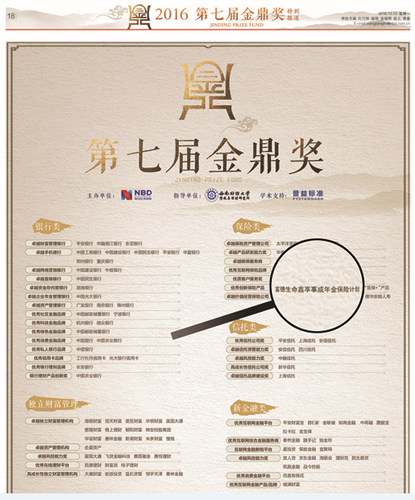 12月9日,由《每日經(jīng)濟(jì)新聞》主辦的第七屆金鼎獎(jiǎng)?lì)C獎(jiǎng)典禮暨“2016金鼎之夜”在北京盛大召開,來(lái)自國(guó)家商務(wù)部、物資部、發(fā)改委以及金融行業(yè)的逾百位政商界權(quán)威人士共同參與。典禮上揭曉了第七屆金鼎獎(jiǎng)評(píng)選結(jié)果,“富德生命鑫享事成年金保險(xiǎn)計(jì)劃”以匠心獨(dú)運(yùn)的設(shè)計(jì)理念,及良好的客戶體驗(yàn)榮獲“優(yōu)秀創(chuàng)新保險(xiǎn)產(chǎn)品”大獎(jiǎng)。